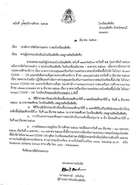 ประกาศ โรงเรียนสัตหีบ แจ้งกำหนดการ ยกเลิกการจัดกิจกรรมต่างๆ ของโรงเรียน เนื่องด้วยการเฝ้าระวังการแพร่ระบาดของเชื้อไวรัส Covid-19 รายละเอียดเพิ่มเติมตามเอกสารที่แนบ