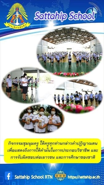 ๓. กิจกรรมชุมนุมครู ให้ครูทุกท่านกล่าวคำปฏิญาณตน เพื่อแสดงถึงการให้คำมั่นในการประกอบวิชาชีพ และการรับผิดชอบต่อเยาวชน และการศึกษาของชาติ