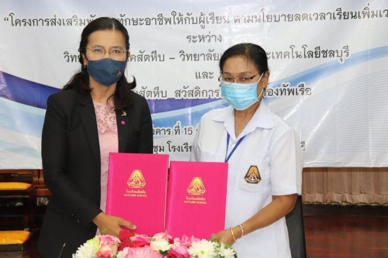 วันที่ 15 ก.ย.63 โรงเรียนสัตหีบ โดยนางศุภภาณี คลังเงิน ผู้อำนวยการโรงเรียนสัตหีบ และนางอรทัย โยธินรุ่งเรือง ผู้อำนวยการวิทยาลัยเทคนิคสัตหีบ ร่วมลงนามบันทึกความร่วมมือทางวิชาการ ( MOU ) ” โครงการส่งเสริมพัฒนาทักษะอาชีพให้กับผู้เรียน ตามนโยบายลดเวลาเรียนเพิ่มเวลารู้ ” เพื่อประสานความร่วมมือทางวิชาการระหว่างกันทางด้านการฝึกอบรม การศึกษาต่อ และส่งเสริมให้มีกิจกรรมพิเศษร่วมกันตามความเหมาะสม ในการพัฒนาศักยภาพของบุคลากร วิทยาการสมัยใหม่ด้านวิชาชีพรวมถึงด้านการพัฒนานักเรียนนักศึกษา เกี่ยวกับการเตรียมความพร้อมเข้าสู่ตลาดอาชีพหรือศึกษาต่อทางวิชาชีพ เพื่อให้เกิดประโยชน์สูงสุดต่อการพัฒนาบุคลากรเข้าสู่เขตพัฒนาเศรษฐกิจพิเศษภาคตะวันออก ( EEC ) รองรับการพัฒนาประเทศให้เจริญก้าวหน้าและความั่นคงในภูมิภาค